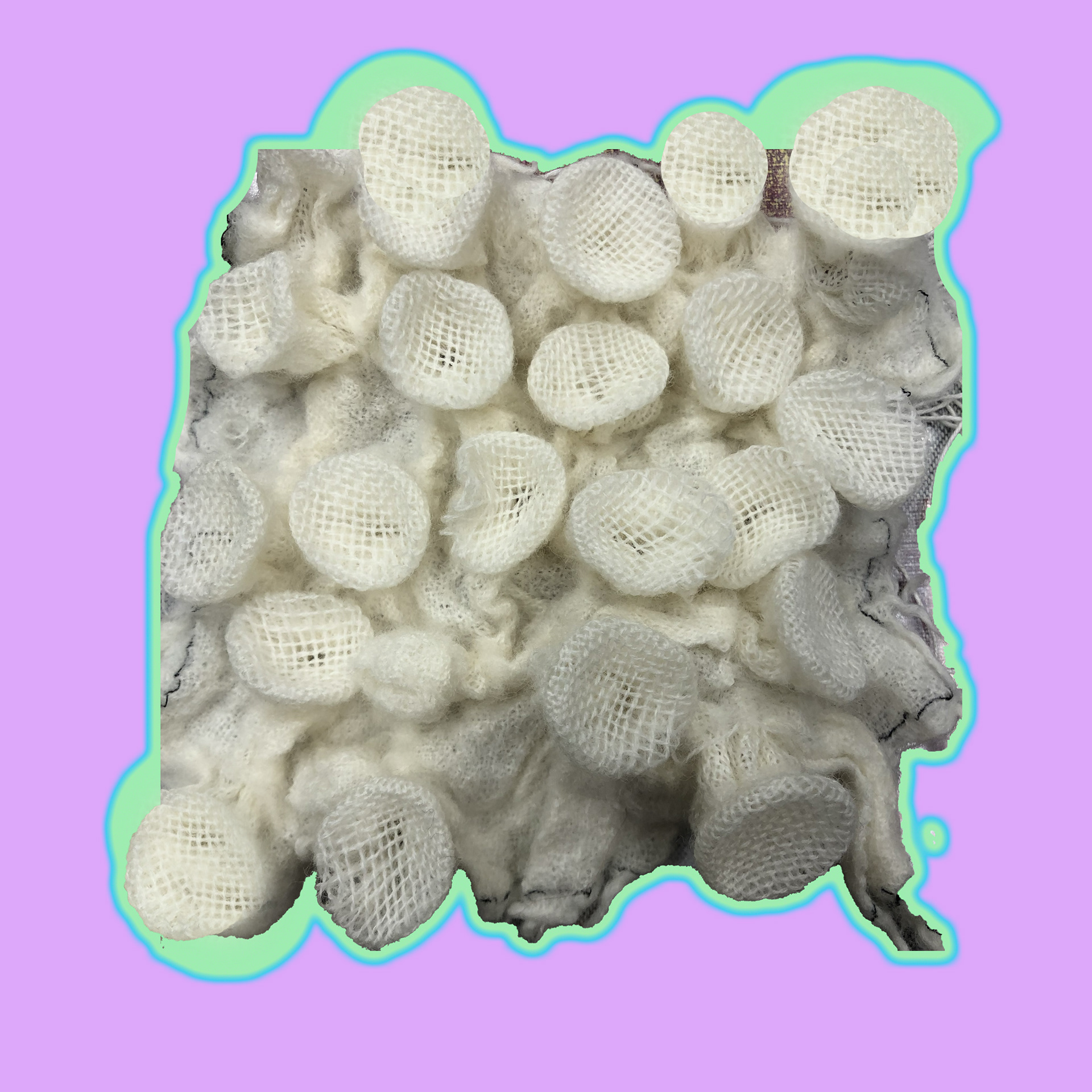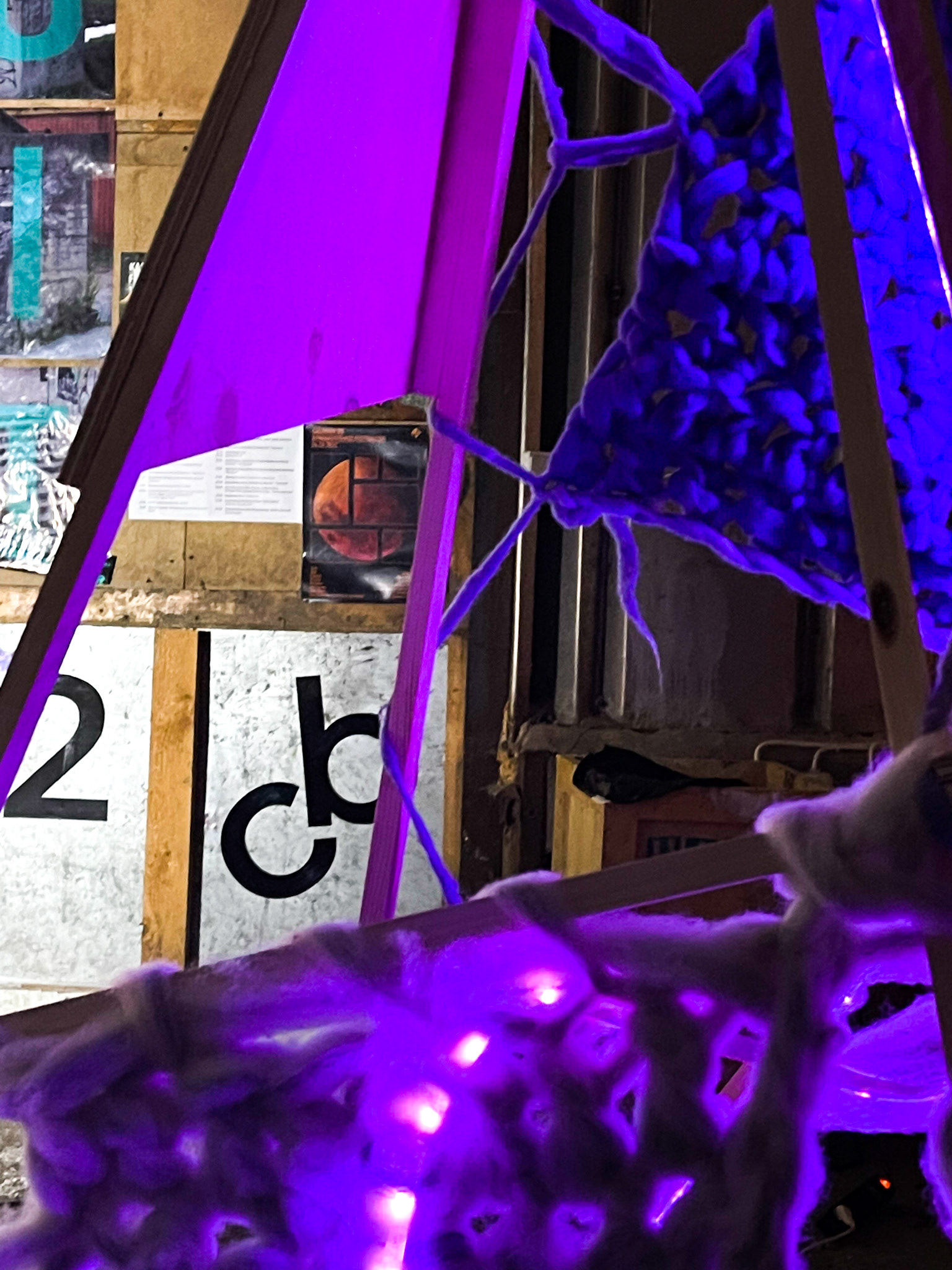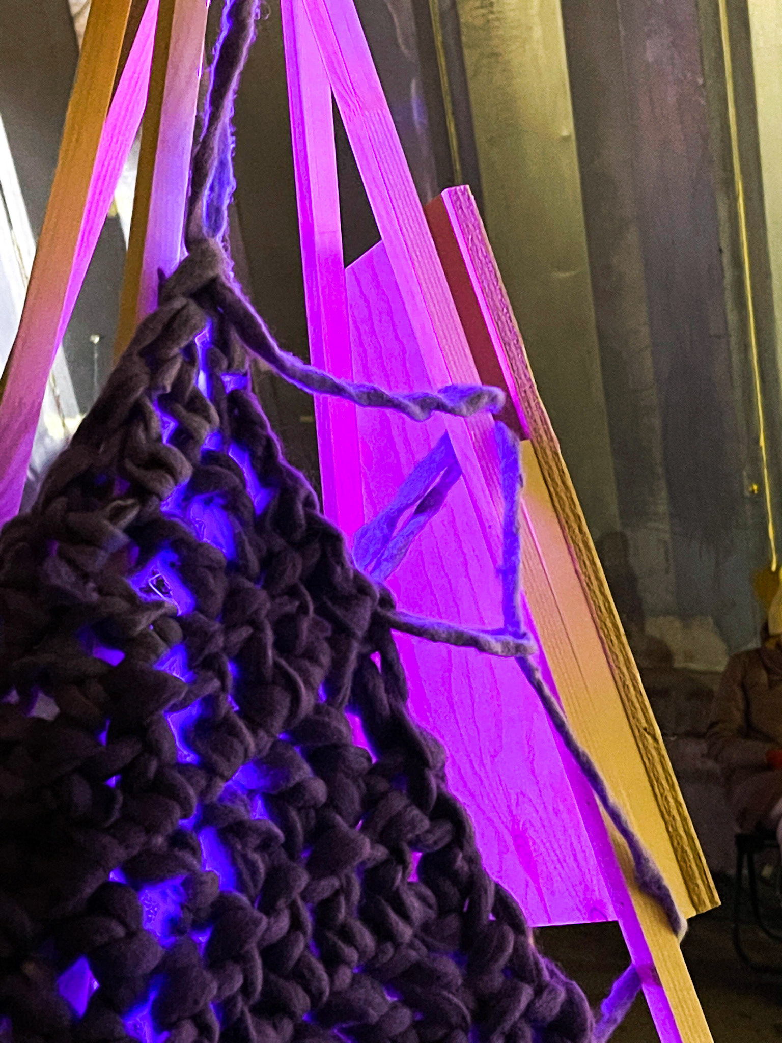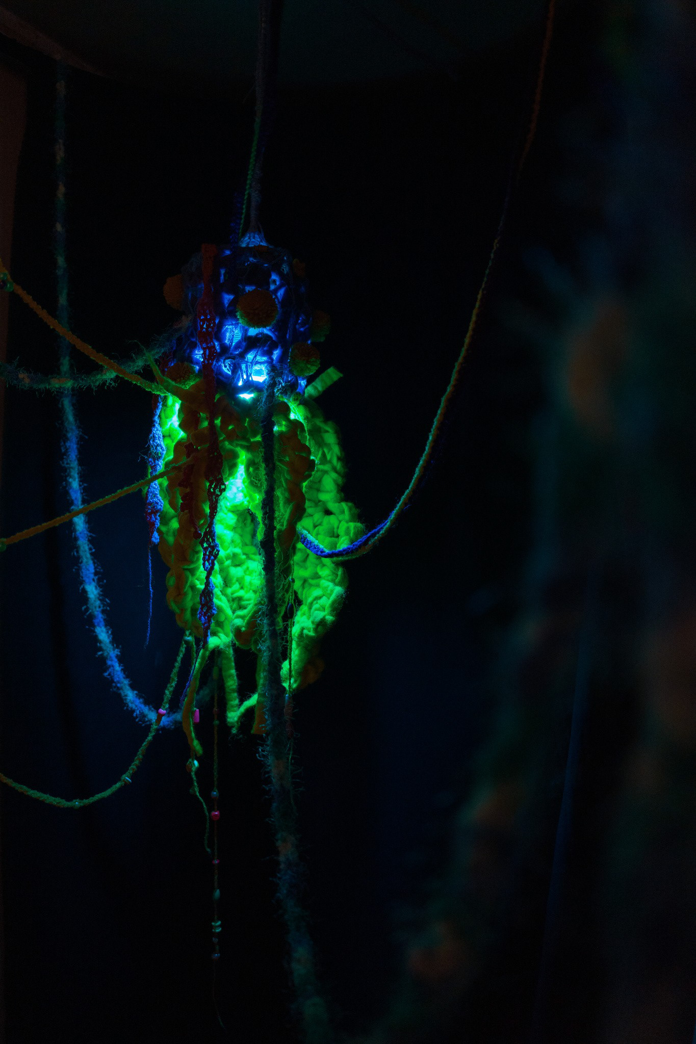For this captivating contemporary textile art piece, I employed an array of materials, including wool, found objects, a luminous lightbulb, and wire, blending traditional and unconventional elements.